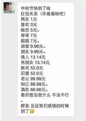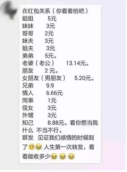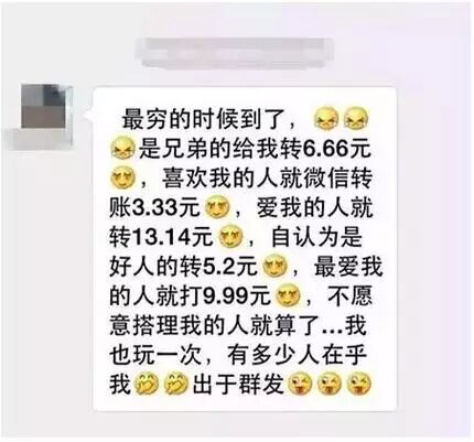 “世界那么大,我想去看看。是朋友的給我發(fā)5元,喜歡我的人就發(fā)6.66元,愛我的人發(fā)5.20元,自認為是好人的發(fā)8.88元,最愛我的人就發(fā)13.14元,不愿意搭理我的人就算了,我也玩一下,看看有多少人在乎我,有多少好人呢?坐等。十一快到了……”
