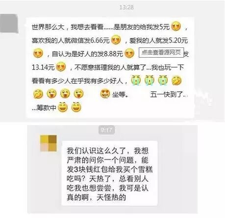 網(wǎng)友“李溫”:真的特別討厭微信圈里群發(fā)要錢的!不管是紅包還是天冷要買熱水袋,還是天熱要買冰淇淋,你丫的自己連幾元錢都沒有嗎?我給了是咱交情好,不給,又怕你說不夠朋友,算了,我還是給了。