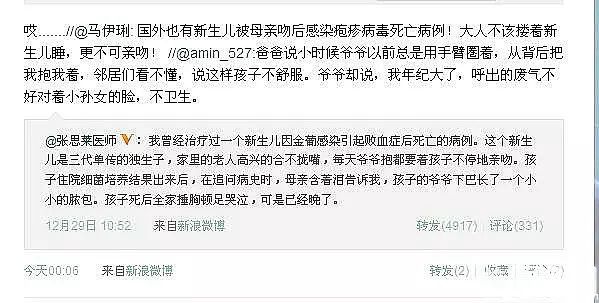 這條微博發出后,就引起了廣大博友的關注。就連明星馬伊琍也轉發了這條博文,并說她以前也知道國外有新生兒被母親吻后感染皰疹病毒死亡的病例。