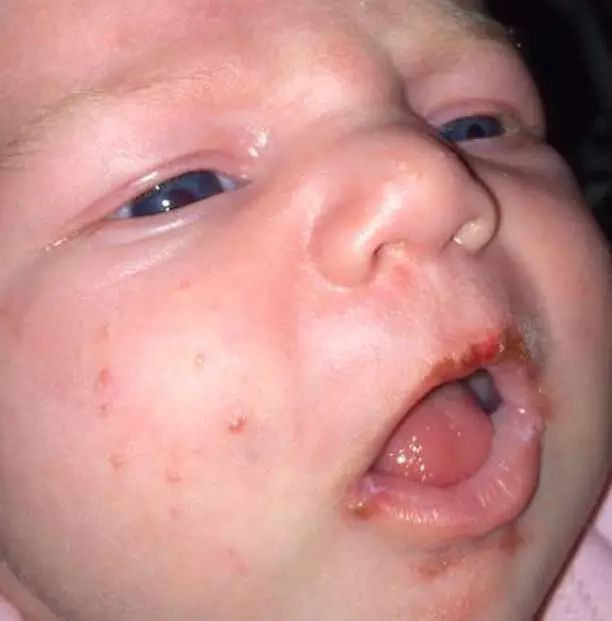因為小布魯克剛剛滿月,最近有好多親朋好友過來看她,大家都爭相恐后地抱她、親她,結果就被染上了皰疹病毒,盡管當時來的人身上并沒有顯現出來。