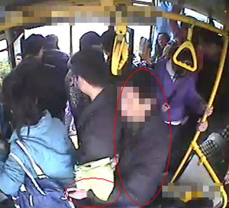 正在乘客排隊刷卡時,眼鏡男迅速貼近前方一名乘客,從其上衣口袋掏出一部手機(jī),退回到車下,被早有準(zhǔn)備的盧曙光控制。