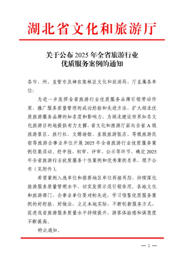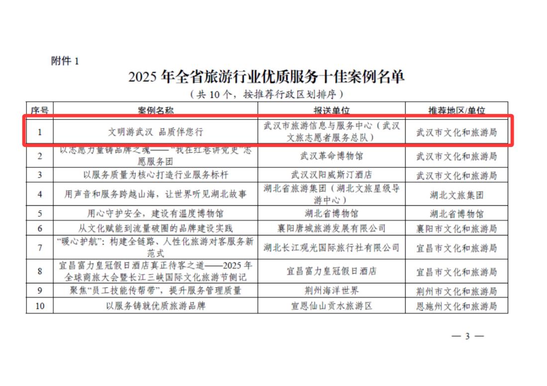 近日,湖北省文化和旅游廳公布2025年全省旅游行業(yè)優(yōu)質(zhì)服務(wù)案例名單,由武漢市文化和旅游局推薦、武漢市旅游信息與服務(wù)中心(武漢文旅志愿者服務(wù)總隊)申報的“文明游武漢 品質(zhì)伴您行”志愿服務(wù)項目成功入選全省旅游行業(yè)優(yōu)質(zhì)服務(wù)十佳案例。