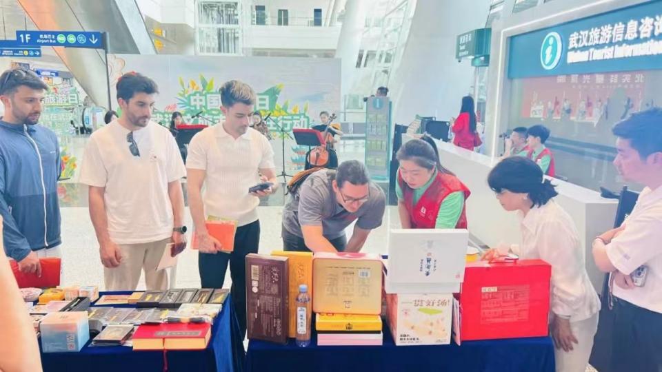 2025年5月19日中國旅游日,文旅志愿者服務(wù)總隊在天河機場與愛樂樂團聯(lián)合組織活動,志愿者為國外游客介紹湖北文創(chuàng)產(chǎn)品。