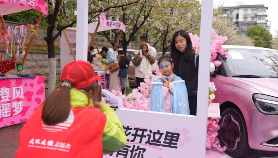 2025年3月29日至30日,文旅志愿者在楚天傳媒大廈櫻花停車場為游客拍照