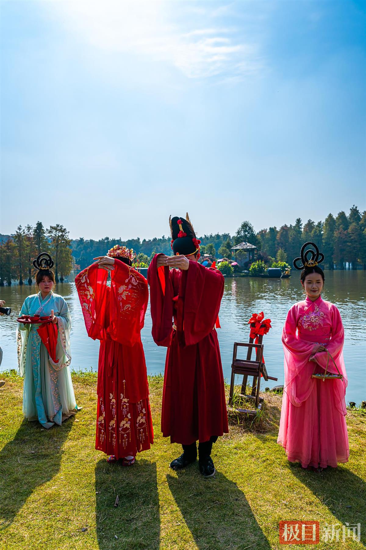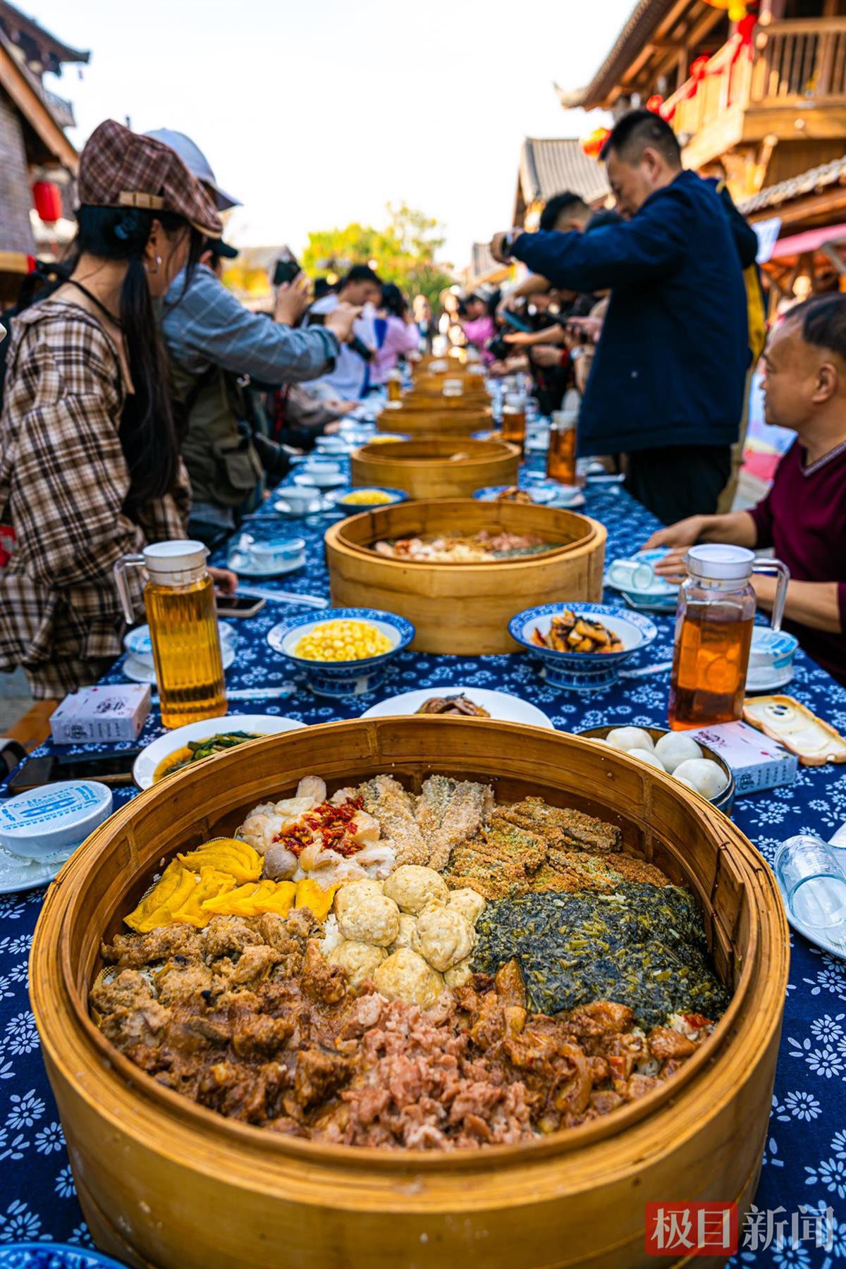 采風團先后走進夢里水鄉、沔陽小鎮,泛舟水上森林,觀看水上婚禮,欣賞大雁伴飛、飛車絕技。為了提升活動效果,一場大型行進式融媒體直播在沔陽小鎮同步開啟,吸引來自全網的560萬人次線上觀看。近百名游客朋友與采風團共進長桌宴,“開籠咯……”仙桃市沔陽三蒸美食協會榮譽會長李和鳴領銜開籠儀式,一道道沔陽三蒸,17項非遺美食輪番亮相,現場游客朋友紛紛拍照打卡,連連點贊。