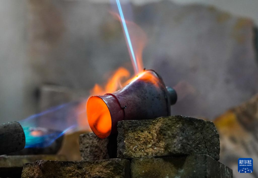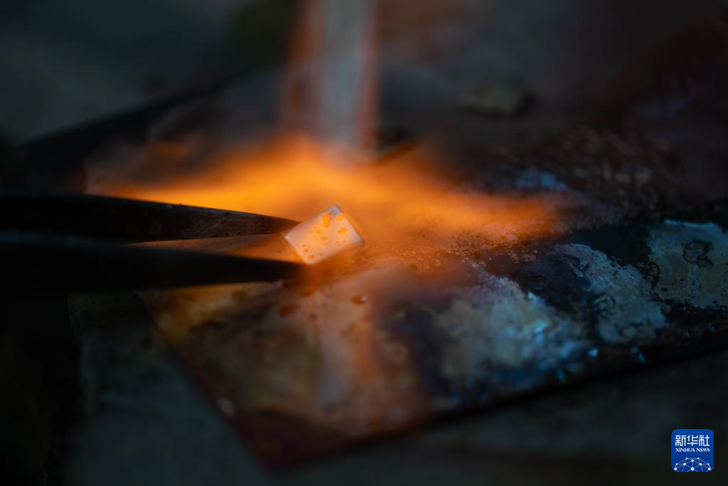 ??10月25日,在昆明烏銅走銀傳習館,匠人將放置在烏銅片表面的銀片融化,進行“走銀”。