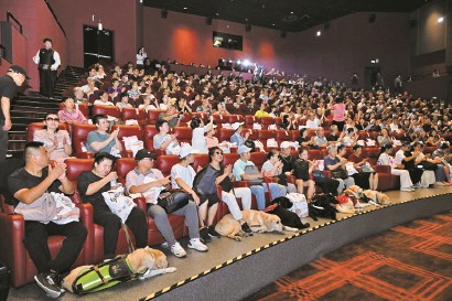 在志愿者引導下,導盲犬的主人在影廳第一排坐下,犬只安靜趴在腳邊。整個影廳360多個座位幾乎滿座。與日常觀影不同,這里的觀眾幾乎都是視障者,影廳一角還配備了專門的現場解說團隊。當燈光暗下,銀幕亮起,除了影片本身的臺詞和配樂,現場還響起了一道溫暖的人聲,描述著人物的表情、場景的變換、動作的細節……