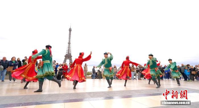 圖為烏蘭牧騎演員在埃菲爾鐵塔下跳起蒙古舞。王禹攝