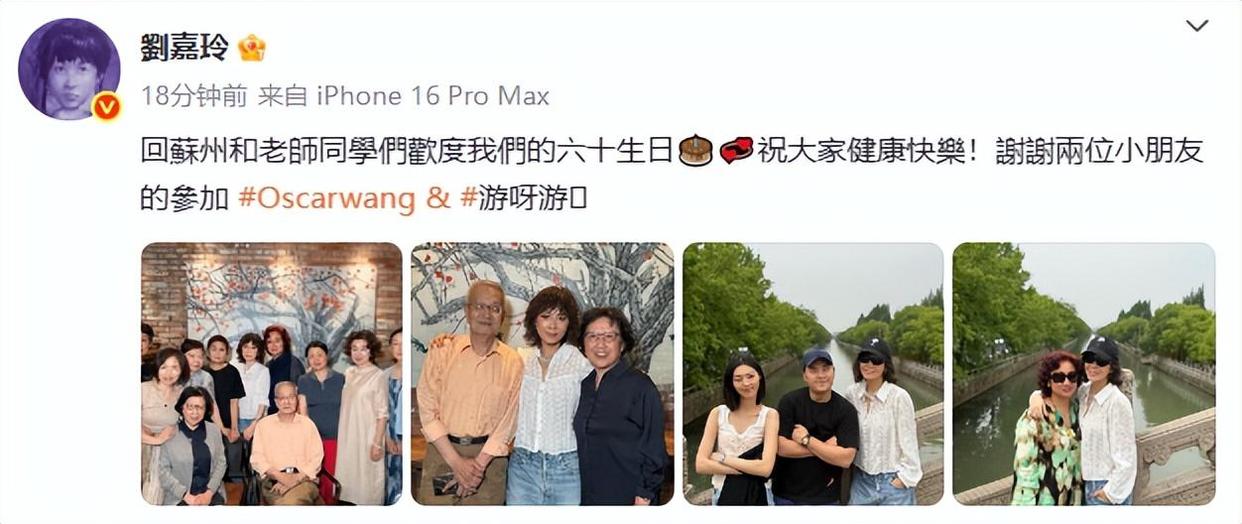 10月31日,劉嘉玲更新社交平臺,曬出自己回蘇州與老師聚會的照片,并配文:回蘇州憶童年,50年師生情像老酒,越陳越醇。