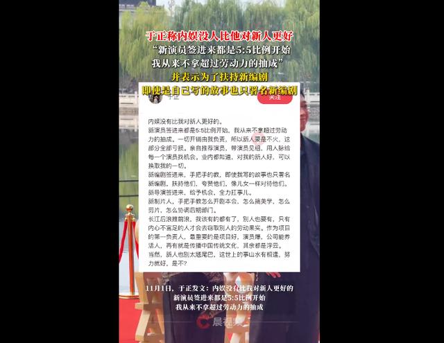 11月1日,@于正發文:內娛沒有比我對新人更好的,新演員簽進來都是5:5比例開始,我從來不拿超過勞動力的抽成,新編劇簽進來,手把手的教,即使我寫的故事也只署名新編劇,扶持他們,新導演簽進來,給予機會,全力扛事兒,新制片人,手把手教怎么開劇本會,怎么搞美學。