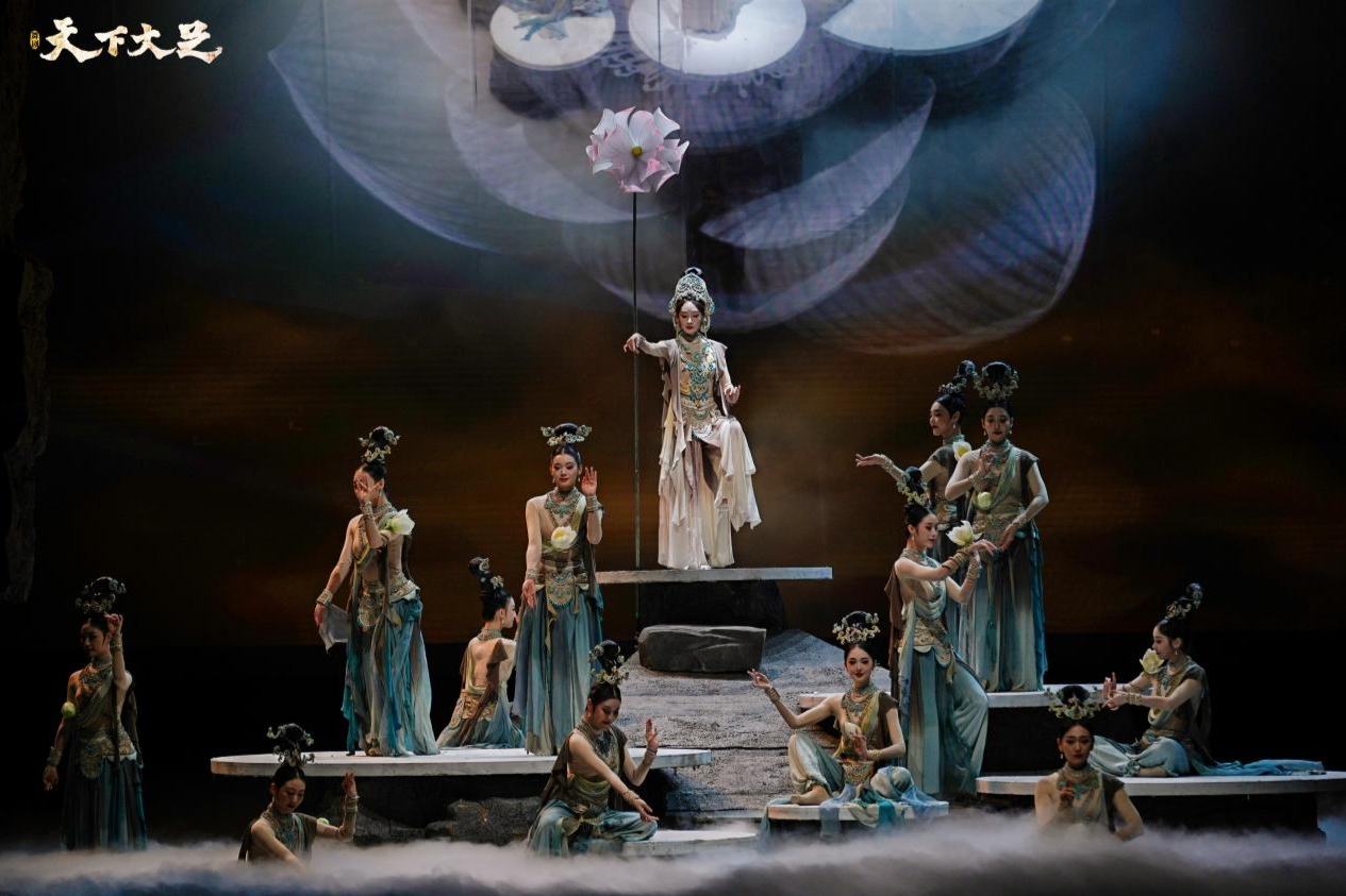 舞劇《天下大足》以舞蹈藝術演繹大足石刻文化,用100分鐘的時長濃縮講述大足石刻400余年的開鑿史。該劇把大足石刻雕刻工匠作為主角,讓演員高度還原大足石刻吹笛女、媚態觀音等經典造像,以濃墨重彩的篇章描繪人間煙火氣,生動呈現大足石刻的世俗化、生活化的特點。