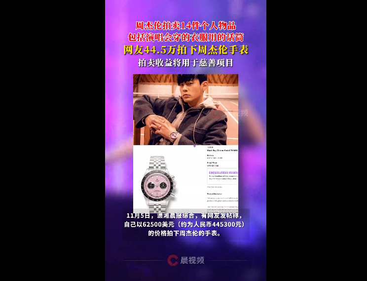有網友發帖稱,自己以62500美元(約為人民幣445300)的價格拍下周杰倫的手表。