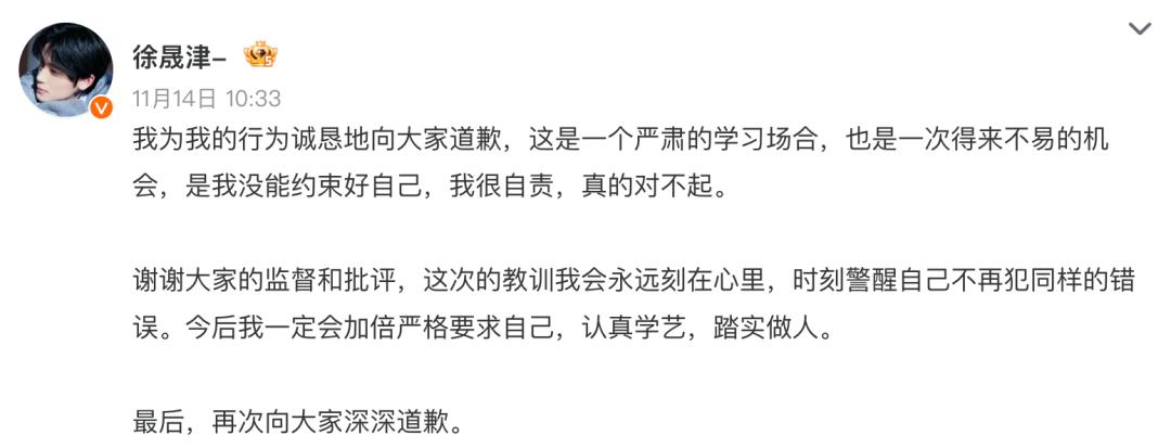 11月14日,徐晟津發(fā)文道歉: