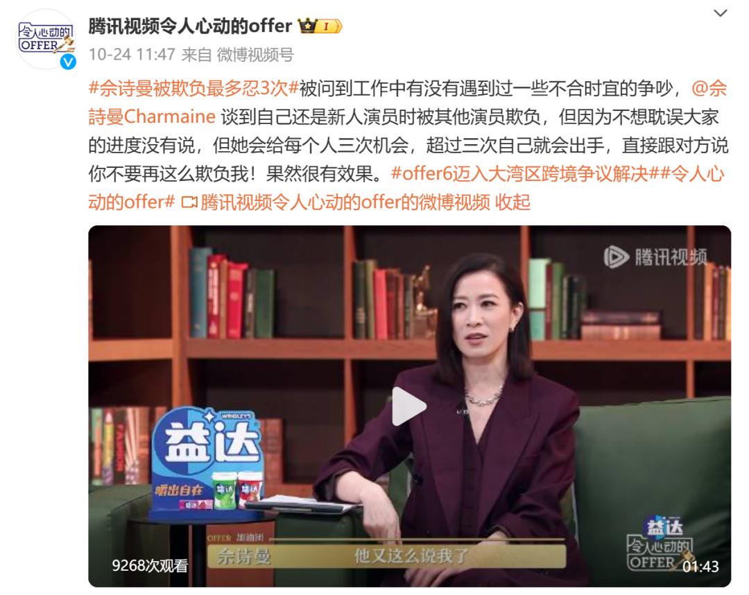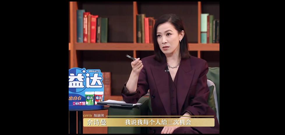 節目中當提到工作中有沒有遇到過一些不合時宜的爭吵時,佘詩曼分享了自己做新人時的經歷。佘詩曼表示,(同劇男演員)他會對你指指點點、說你走錯位、擋住光這些,而且還是當著所有人的面說,有種給新人下馬威的感覺。面對這種情況,佘詩曼隨后表示“因為我是一個很冷靜的人,我不想影響到大家的進度、情緒,所以什么都不想,但是我會給每個人三次機會,如果你再來的話,我就出手了。”