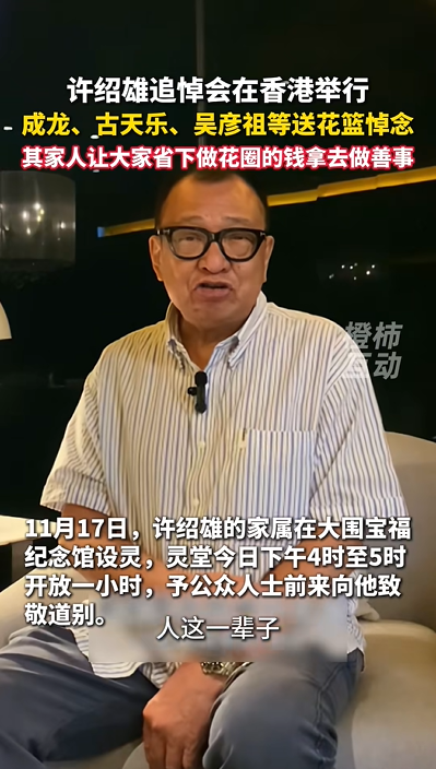 11月17日,港劇“金牌綠葉”許紹雄追悼會(huì)在香港大圍寶福紀(jì)念館舉行。家屬表示喪事從簡(jiǎn),按遺愿將帛金全數(shù)捐給兒童癌病基金。現(xiàn)場(chǎng),黃宗澤、譚俊彥到場(chǎng)悼念,成龍、吳彥祖、古天樂(lè)、宣萱、胡杏兒、林峯等眾星送上了悼念花牌。