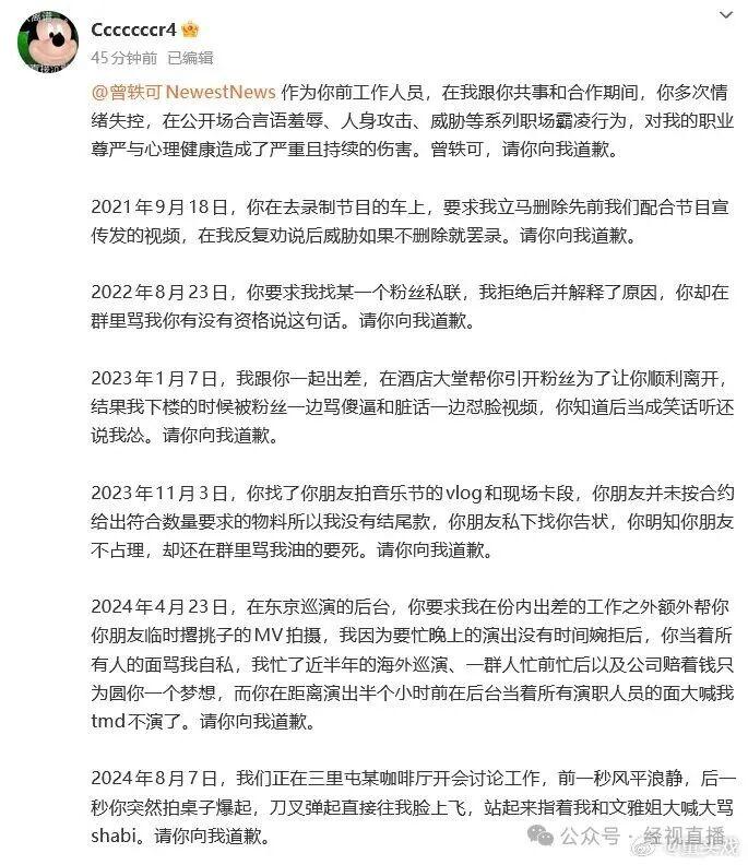 11月17日上午,一位自稱是曾軼可前工作人員在公開社交平臺(tái)發(fā)布長(zhǎng)文,指控在合作期間多次遭遇對(duì)方情緒失控、公開言語羞辱、人身攻擊、威脅等職場(chǎng)霸凌行為,并直言:“這不是所有,也不是僅僅發(fā)生在我身上。”
