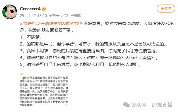 在文字爆料引發(fā)熱議后,曾軼可現(xiàn)任助理發(fā)朋友圈對(duì)質(zhì)前工作人員: