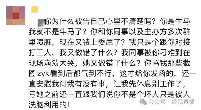 “你為什么被告自己心里不清楚嗎?你是牛馬我就不是牛馬了?你和你同事以及主辦方多次群里噴臟,現(xiàn)在又裝上委屈了?我只是個(gè)跟你對(duì)接打工人,我又做錯(cuò)了什么?我同事被你刁難到在現(xiàn)場(chǎng)崩潰大哭,她又做錯(cuò)了什么?你罵我那些截圖zyk看到后都?xì)獾讲恍校@才給你發(fā)函的,還一直安慰我問我有沒有事,讓我先休息別工作了,虧她之前還一直跟我們說你不是個(gè)壞人只是被人洗腦利用的。”