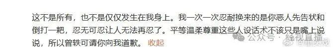貼文中還稱“一次一次忍耐換來的是惡人先告狀和倒打一耙,忍無可忍讓人無法再忍了,平等、溫柔、尊重這些人設(shè)話術(shù)不該只是嘴上說說,所以曾軼可請(qǐng)你向我道歉。”
