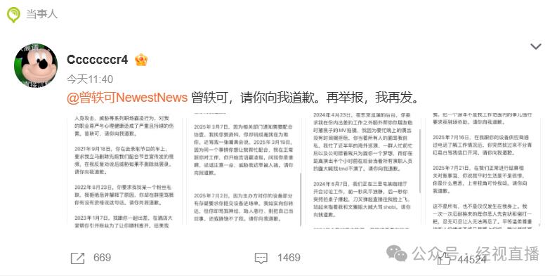上午11點(diǎn)40分,當(dāng)事人再發(fā)布新帖子,其中稱“曾軼可,請(qǐng)你向我道歉,再舉報(bào),我再發(fā)。”