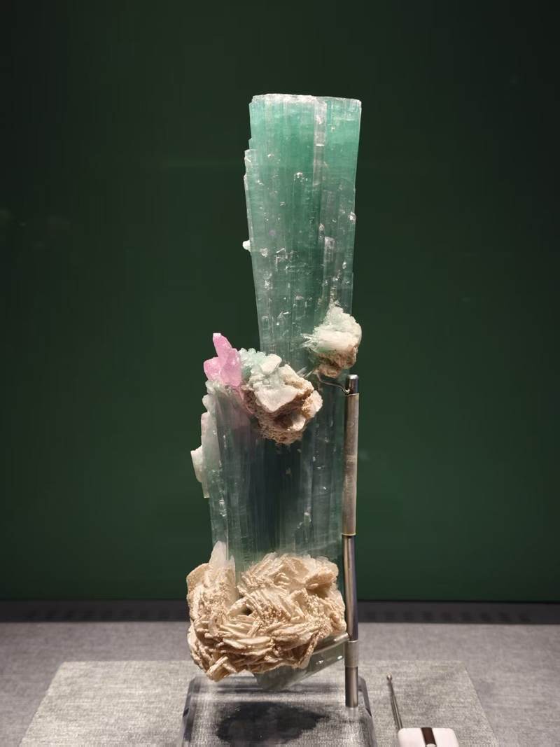 展廳中,一件五彩斑斕的碧璽格外吸睛。國家自然博物館展覽策劃部主任苗雨雁介紹,這件碧璽顏色柔和,堪稱“鎮館之寶”。“碧璽的礦物成分非常復雜,這些礦物元素就像大自然的‘魔術師’,能讓碧璽呈現出多彩、獨特的顏色。由于它在壓力、溫度的作用下會發生變色,使它有了依附微小灰塵的作用,所以也叫‘吸灰石’。”
