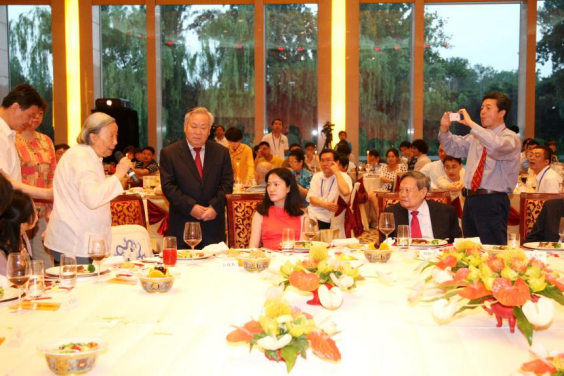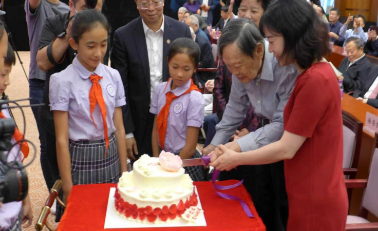 在清華大學舉辦的百歲生日慶典上與翁帆一起切生日蛋糕