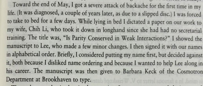 我根據我們的討論,不僅寫完了全篇論文,而且哥倫比亞大學物理系理論物理組的行政助理Irene Trarmm女士連我手寫的全部論文都已經打字出來了。.......我打電話找他(指楊振寧,引者注)也找不到。等到發現這些情況之后,催促他趕快將Irene女士早就打好的論文送入《物理評論》,那已經是三個星期后,1956年6月22日的事了。