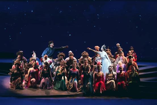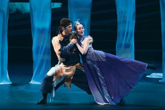 在演出現(xiàn)場,賽里木湖的冰雪消融、草原花開、秋葉靜美、冬冰永恒一一復(fù)刻于舞臺。觀眾跟隨《序·初識》《春·邂逅》《夏·鄉(xiāng)戀》《秋·情長》《冬·送別》《尾聲·守護》六幕篇章,沉浸于一段從初見到守護的完整愛戀。劇中,策馬奔騰的豪情、天鵝曼舞的優(yōu)雅、守護神“雪狼”的野性神秘,與湖光山色的四季流轉(zhuǎn)交相輝映,不僅講述著青山與藍冰的古老傳說,更傳遞著對生態(tài)和諧、民族深情的禮贊之情。