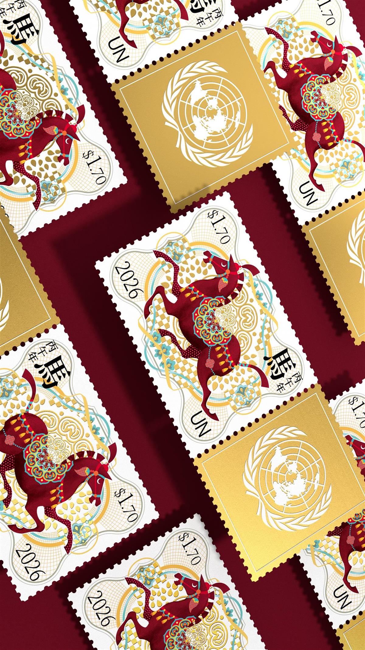 這枚由聯合國郵政署發行的丙午年生肖馬票,設計靈感取自東漢青銅器“銅奔馬”,而配色和背景,則從敦煌汲取了靈感。