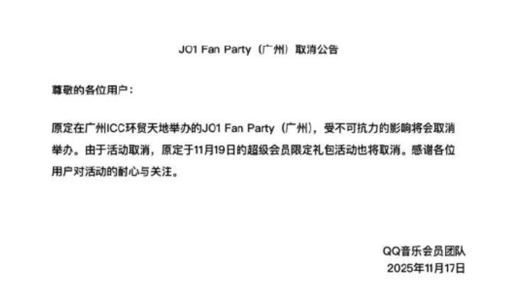 17日晚,QQ音樂在社交網(wǎng)站上發(fā)布一則公告稱,“原定在廣州舉辦的JO1 Fan Party,受不可抗力的影響將會取消舉辦。”